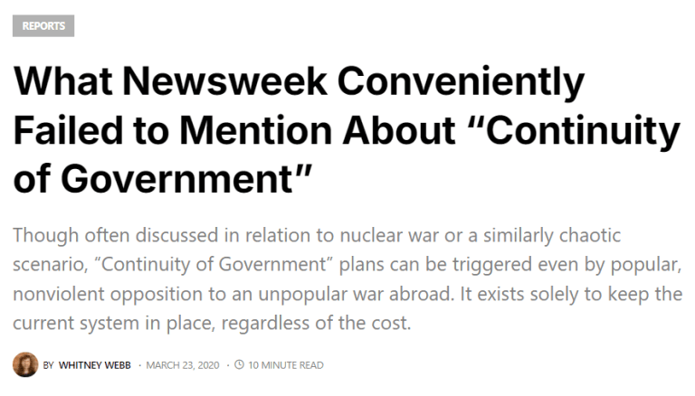 MSM Newsweek ironically forecasts a “Continuity of Gov’t” scenario based upon the possibility that the US Govt ceases to maintain essential functions due to Covid ramifications. Whitney Webb, an alt-media…